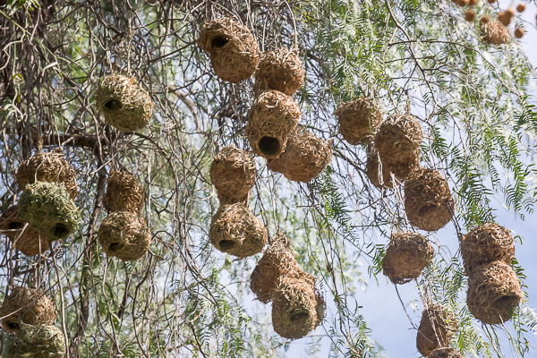 | gibt aber noch dieses tolle Bild, denn an einem Baum, unmittelbar bei der Straußenfarm finden wir diese vielen Nester. Der Webervogel ist hier heimisch und brütet in einigen hundert Nestern. |