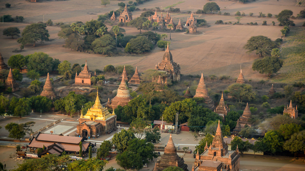 | sehen viele hundert Pagoden. Allerdings bringt uns der Wind nicht in die Richtung der Pagoden - wir fahren zum Fluss - keine Pagoden. Der Pilot hat die Lösung - wir steigen - oben ist der richtige Wind und wir nehmen Kurs auf die vielen Pagoden und Tempel. Ein Bild wie wir es erwartet hatten. Ein Erlebnis, |