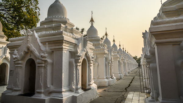 daw-Pagode befinden sich mit Spiegelmosaiken verzierte Pavillons, in denen Buddhafiguren verehrt werden. Diese riesige Anlage ist sehr beeindruckend, wir befinden uns im größten Buch der Welt. Überall sehen wir diese weißen kleinen Pagoden. Und wirklich in jeder dieser kleinen Pagoden ist eine Marmor-