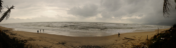 Wetterscheide an der Grenze zwischen Nord- und Südvietnam. zwischen Da Nang und Hoi An - Da Nang sei 110 km entfernt und Hoi An 150 km. Es sind interessante Bauwerke im Fluss zu sehen - es scheinen Fischerhütten mit kleinen Steegen zu sein, denn Wohnhäuser - kann ja nicht sein, die saufen ja bei dem