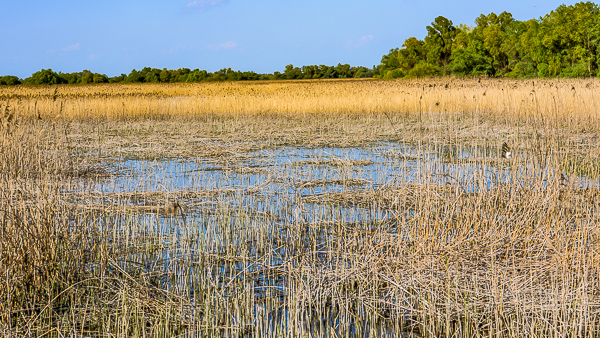 ein riesiges Seengebiet, Bäume, Strächer und Binsen ragen aus dem fast stehenden Wasser. Kormorane, Reiher und andere Wasservögel finden sich hier. Allerdings sind die Pelikane wohl noch