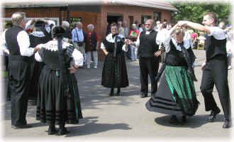 Was ist anders heute, als vor einigen Wochen - nur wenig auf den ersten Blick. Zwei Eichen-büsche trägt die Mühle an den oberen Enden der Windflügel. Auf den zweiten Blick ist riesig was los. Viele Besucher haben sich ein-gefunden, um am Mühlentag den leckeren Kuchen (Butterku-chen, Bienenstich, Heidelbeer- und Rabarberku-chen) zu genießen. Der Kuchen ist natürlich mit selbstgemahlenem Mehl von der Frau des Müllers gebacken wor-den. Die ganze Familie ist im Ein-satz, um die Gäste zu bewirten. Ein ganz besonderer Höhepunkt die Darbietungen der Trachtengruppe aus dem Dorf. Es sind fast al-les nur ältere Tänzerinnen und Tänzer in Trachten angetreten. Der Müller berichtete uns schon beim ersten Besuch, dass diese Trachtengruppe nicht mehr den großen Nachwuchs in der Hinterhand |
